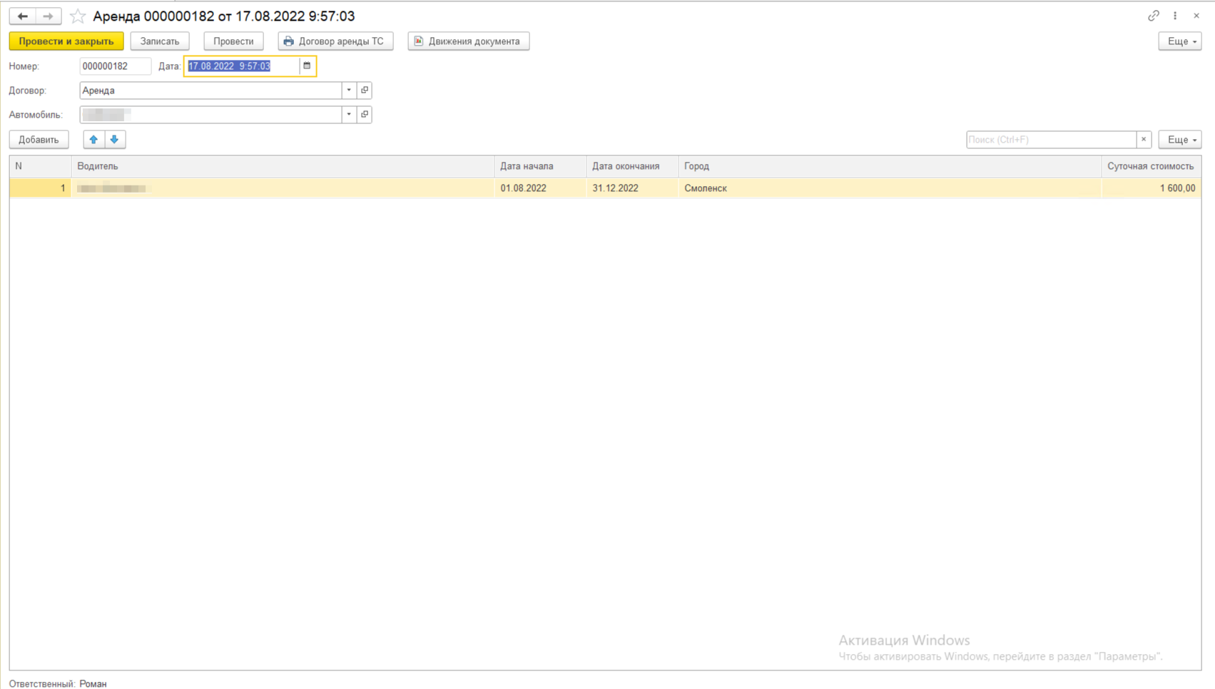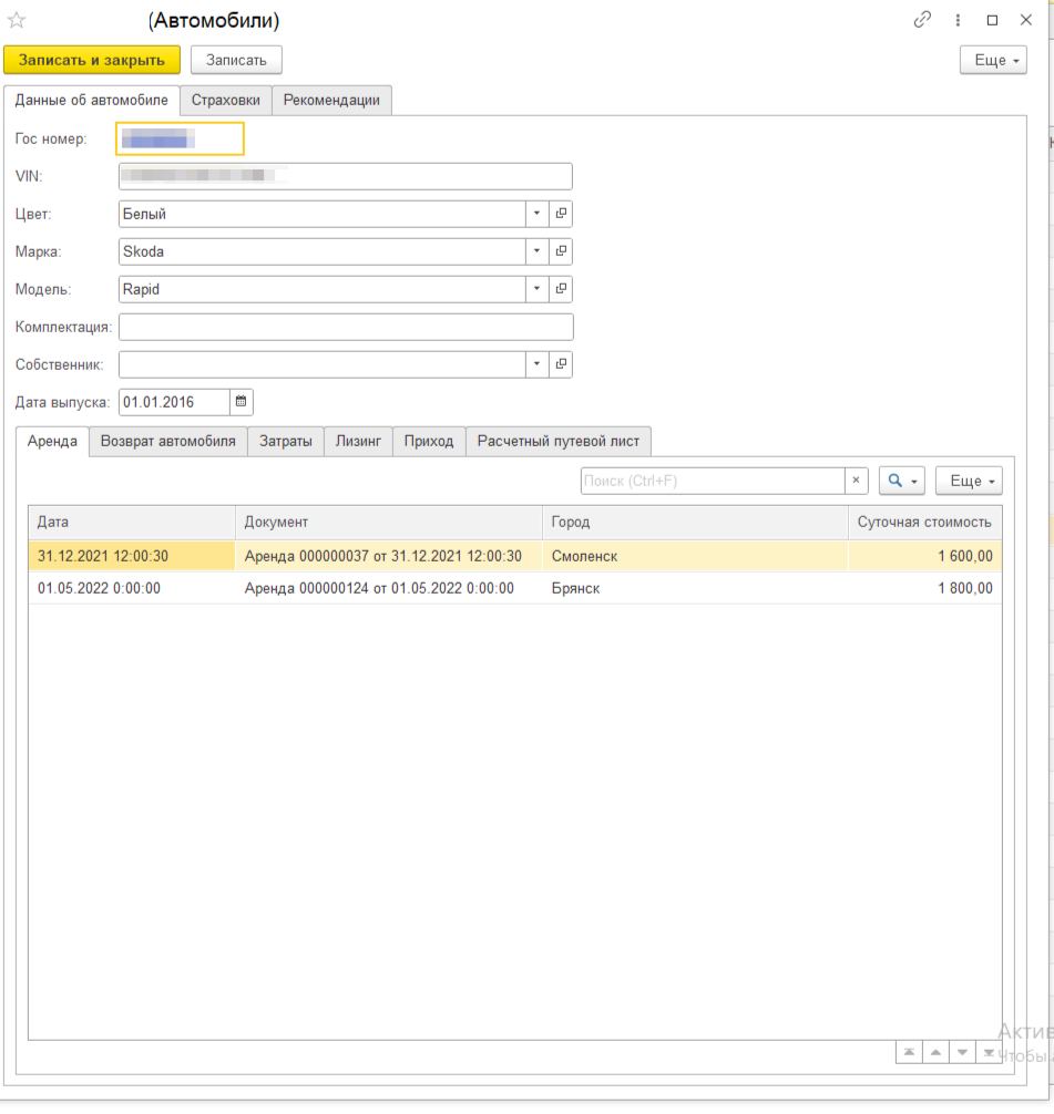 Разработка 1С-конфигурации для учета автотранспортных средств, передаваемых в аренду